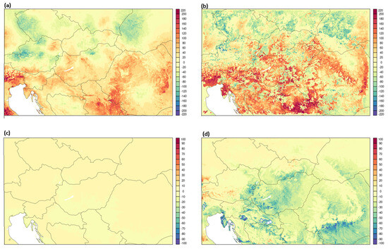 The previously mentioned features in soil moisture increments are also visible spatially (Figure 10), although some variations are climatically controlled combined with soil texture patterns. In summer, the spatial structure of the soil moisture increments was similar for the SEKF and OI-MAIN, as positive increments were experienced in the central and southern part of the area and negative in the northern part. The positive increments reached up to 200 mm in many areas, while the negative ones were more moderate. Compared to the SEKF, the increments produced by OI-MAIN were smoother and smaller. In contrast, the SEKF obtained more fine-scale variability.