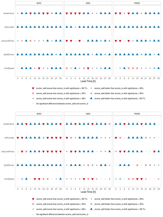 These results suggest that the seasonal variability in atmospheric conditions might influence the forecasts produced by the SEKF. As mentioned earlier, the winter and spring were dominated by dry and cool anticyclonic weather patterns, during which the soil had a strong impact on the near-surface atmospheric layers. Under these weather conditions, the SEKF improves the forecast of near-surface parameters and their diurnal cycle compared to OI-MAIN. This suggests that the SEKF is particularly effective when land–atmosphere interactions play a dominant role. On the other hand, under different meteorological conditions, the impact of the SEKF is more limited.