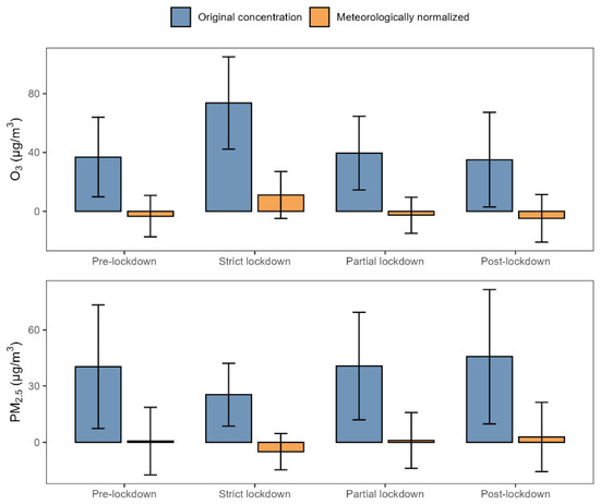 Concentrations of O3 and PM2.5 in Jiaxing during the pre-lockdown, strict lockdown, partial lockdown, and post-lockdown periods. Gray-blue bars represent mean observed concentrations, with error bars indicating standard deviations. Light orange bars show meteorologically normalized concentrations derived from random forest regression models, with error bars representing standard deviations. The meteorological normalization process removes the influence of meteorological factors on pollutant concentrations, revealing the impact of emission changes during different lockdown periods.