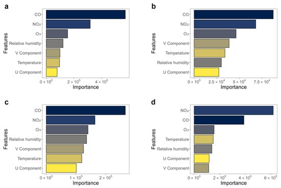 Feature importance ranking derived from impurity reduction calculations in random forest regression models for O3 during four different periods: (a) pre-lockdown, (b) strict lockdown, (c) partial lockdown, and (d) post-lockdown. Higher importance values indicate a greater contribution of the corresponding variable to the model performance.