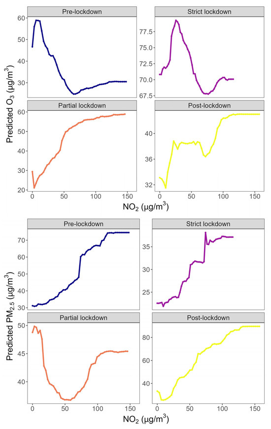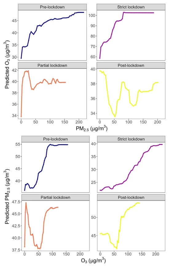 Partial dependency analysis revealed significant variations in NO2 influences on O3 and PM2.5 across different lockdown periods, reflecting atmospheric chemical process adjustments driven by emission pattern changes (Figure 4). For NO2 effects on O3, the pre-lockdown and strict lockdown periods exhibited characteristic VOC-limited response patterns: high O3 at low NO2 concentrations, decreasing O3 with increasing NO2, and slight O3 recovery at high NO2 levels. This non-monotonic response pattern corresponds to the characteristic features of VOC-limited regimes widely observed in photochemical studies, indicating predominant VOC-limited photochemical conditions during these periods [43,44]. As control measures evolved, partial lockdown and post-lockdown periods showed transformation toward nearly linear positive correlations between NO2 and O3, suggesting photochemical regime transition from VOC-limited toward NOx-limited or transitional conditions due to altered VOCs/NOx ratios.