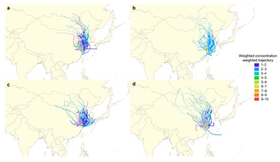We further employed backward trajectory and pollution source potential analysis to investigate regional transport sources of air pollutants affecting O3 and PM2.5 formation in Jiaxing. Figure 6 presents the O3 concentration-weighted trajectory analysis results across the four different periods, where increasingly red coloration indicates a higher probability of a region serving as a potential O3 source area.