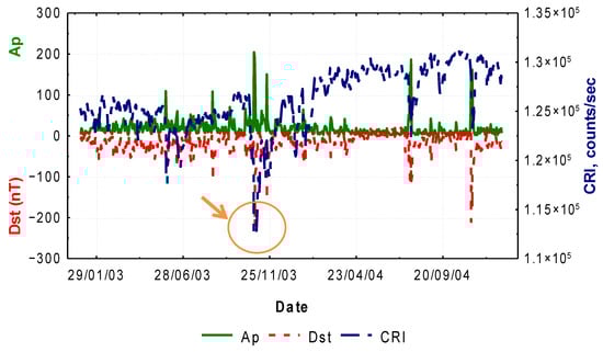 The time interval under investigation is part of the declining phase of solar cycle 23, one of longest cycles since 1847, which lasted from May 1996 to December 2008 [39]. The maximum of Solar cycle 23 was reached between 2000 and 2002 [40]. Even though during the Space Age (1957–today) the strongest geomagnetic storm was registered on March 13–14, 1989 (daily Dst = −225 nT and Ap = 246), the events of October (daily Dst = −221 nT and Ap = 204) and November 2003 (daily Dst = −156 nT and Ap = 150) are also included in the list of most severe decreases in the CRI (level −3) and geomagnetic storms [41]. The storms from late October to early November are known as the Great Halloween Solar Storms, while the geomagnetic storm in the mid-November was characterized as a super storm.