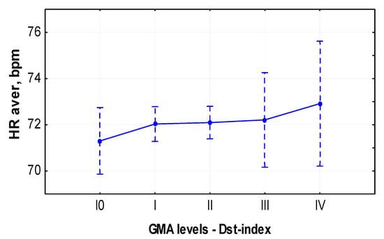 It is stated that the highest GMA levels, for example, levels III and IV of the Dst- and Ap-index categorization are related to greater HR values. In addition, the lowest GMA levels, i.e., levels I0, I and II of the Dst- and Ap-index categorization are related to small variations or even no variations at all [29,46,47,48]. This trend is noticed in Figure 2, where for severe geomagnetic storms (Dst-index level IV) the HR takes its maximum value.