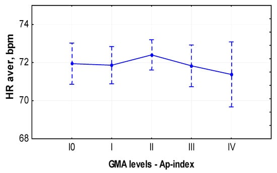 HRaver (bpm) variations for the different levels of Ap-index for Day 0. The vertical bars denote a 0.95 confidence interval.