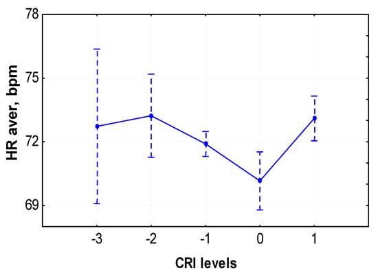 HRaver (bpm) variations for the different levels of CRI for Day 0. The vertical bars denote a 0.95 confidence interval.
