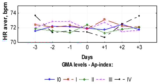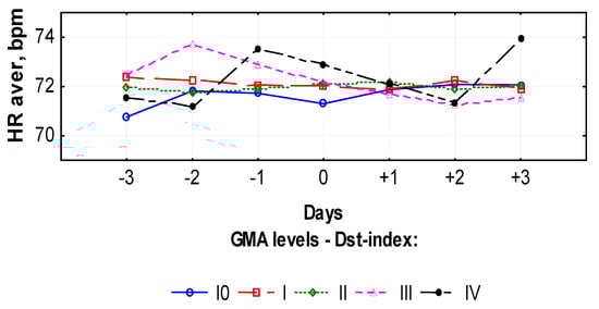 Figure 5 shows the variations in HR in relation to GMA, expressed by the Dst-index. For levels I0, I and II (blue, red and green line, respectively) of GMA (i.e., low GMA) no significant variation was noticed. On the contrary, peak values of HR before and after the event are observed for the two highest levels of GMA, which is in accordance with prior findings [38,45,46]. HR increased on the days before the event and decreased during the event and until 2 days after the event and increased again on day +3rd. More precisely, HR was maximized on day −2nd before the event and decreased from there on until day +2nd after the event (for level III—pink line). Similar behavior is also noticed for level IV (black line). The only difference in behavior between the two higher levels is that HR maximum value has one day delay for level IV (maximum on day −1st).