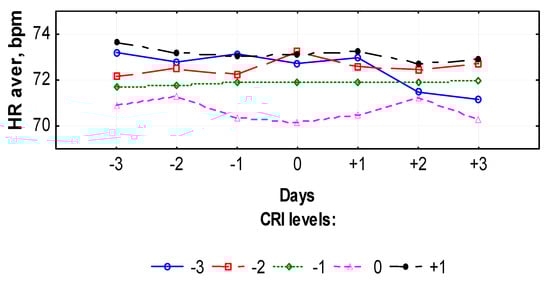HRaver (bpm) variations during days −3rd, −2nd, −1st before, day 0 and days +1st, +2nd, +3rd after the corresponding CRI decrease for all levels of the CRI.