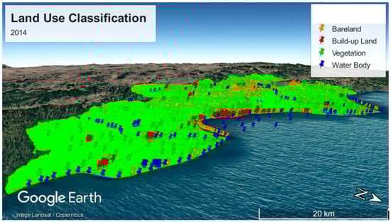 The study was conducted in Samsun, a city and region located on the north coast of Turkiye along the Black Sea. This area is geographically diverse [39], encompassing coastlines, urban development, agricultural fields, and forested areas, making it an ideal location for studying various land cover dynamics. Samsun is located in a humid subtropical zone along the Black Sea coast, with mild winters, humid summers, and year-round precipitation. These climatic conditions contribute to moderate seasonal variability in surface temperatures. Samsun is located on the northern coast of Türkiye, along the Black Sea (coordinates ~41.28° N, 36.33° E). The city has a humid subtropical climate (Cfa, Köppen classification), with an annual precipitation of approximately 1000–1200 mm and average temperatures ranging from 4 °C in winter to 27 °C in summer. The Yeşilırmak and Kızılırmak river basins contribute to regional humidity and land use dynamics. As of 2023, the population of Samsun is approximately 1.4 million, concentrated along coastal urban corridors. Samsun’s diverse landscape provides a comprehensive set of features necessary for robust land cover classification, including both natural and anthropogenic elements. Training and validation datasets were generated from a manually curated set of points within the study area and classified into five categories: water, vegetation, urban, bareland, and crop. Each class was defined based on manually interpreted reference points validated using high-resolution satellite imageryand existing land cover maps (Figure 1).