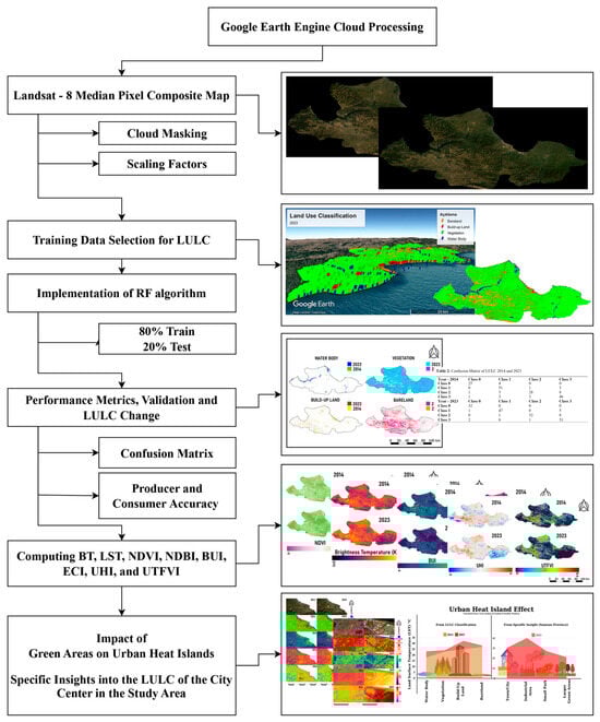 In this study, thermal and vegetative indices, including BT, LST, NDVI, NDBI, BUI, ECI, SUHI, and UTFVI, were examined to assess their dynamics across urban areas, green spaces, water bodies, and barren lands. This analysis utilized cloud-free Landsat 8 imagery sourced from the US Geological Survey via the Google Earth Engine platform, with a one-year median for each pixel. Studies have shown that using a one-year composite improves classification accuracy [43,60]. To achieve this goal, LULC classification was conducted using the random forest algorithm with satellite composite imagery. Overall accuracies of 85% for 2014 and 86% for 2023 were achieved. These success rates are similar to those reported in the literature [31,35]