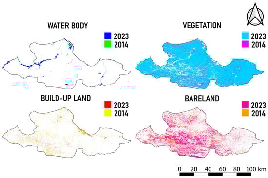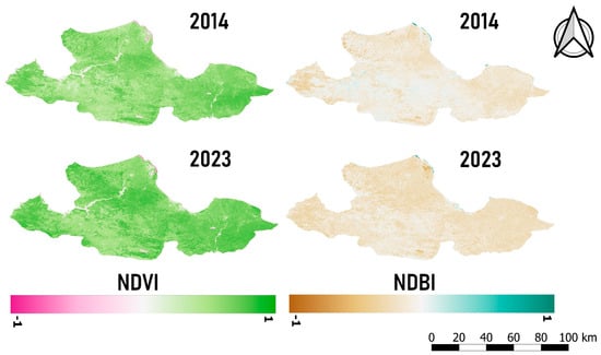 The most significant increase in the NDVI occurred in the vegetation (+0.08) and bareland (+0.09) areas, indicating that barren lands are becoming vegetated and that the existing vegetation is healthier [65]. Despite a 0.02 decrease in the NDBI in urban areas, the spatial NDBI in urban regions, especially in the northeastern part of the study area (the city center), increased due to urban expansion from 2014 to 2023. This trend is consistent with the findings of [66], who observed similar patterns of urban expansion and its effects on the NDBI and related vegetation indices. Additionally, the primary reason for the increase in the four classes of the NDVI is believed to be the increase in rainfall. In 2014, the total rainfall was 562.4 mm, while in 2023, nearly double that amount was recorded at 1084.0 mm [67]. A strong positive correlation is known to exist between NDVI and rainfall, indicating that NDVI consistently increases with rising rainfall levels [68]. Therefore, the differences between the NDVI and related indices are greater and will improve by 2023.