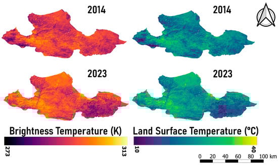 BT: Brightness temperature is the temperature that a black body would have if it emitted the same amount of radiation per unit area at a specific wavelength. This concept is used to derive the actual temperature of Earth’s surface features (such as land or water) based on the thermal radiation they emit [52] (Equation (1)).