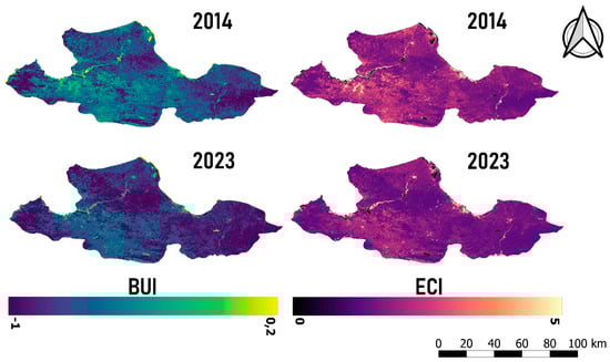 The descriptive statistics for the BUI and the ECI for the years 2014 and 2023 reveal notable trends across different land cover types (Figure 6). For the BUI, the mean water area slightly decreased from −0.05 in 2014 to −0.20 in 2023, indicating a reduction in the built-up intensity. Vegetation areas also experienced a decrease, with mean values decreasing from −0.76 to −0.91, suggesting less anthropogenic impact over time. Urban areas and bareland both exhibited slight decreases in their BUI means, reflecting marginal changes in urbanization and bareland conditions. For the ECI, the mean water area slightly increased from 8.43 to 8.85, while the mean vegetation area slightly decreased from 1.72 to 1.50. The mean ECIs of the urban areas increased from 3.94 to 4.52, indicating greater environmental stress, whereas those of the bareland areas decreased from 2.63 to 2.12 (Table 6).