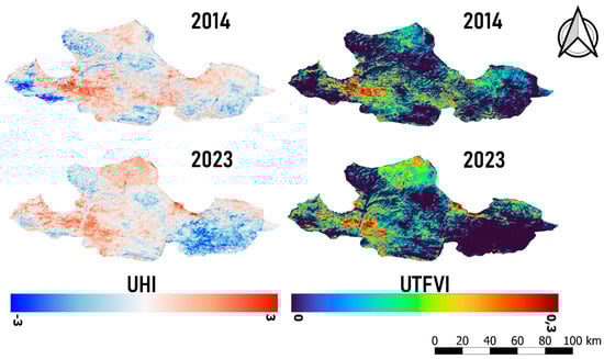 Urban Thermal Field Variance Index (UTFVI): This index measures the thermal differences between urban and nonurban areas by analyzing land surface temperatures. The UTFVI is especially useful for pinpointing areas within cities that have higher temperatures due to factors such as reduced vegetation cover, increased built-up surfaces, and human activities [57] (Equation (8)).