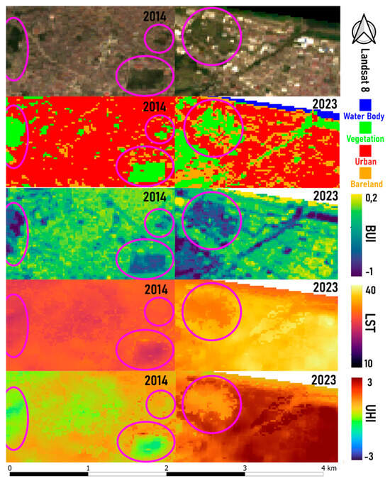 Comparison of green and urban areas between 2014 (left) and 2023 (right) using Landsat 8 imagery and derived indices. The rose-colored circles highlight regions that were identified as green areas (vegetation) in 2014 and 2023. Top to bottom: True color composite, land cover classification, Built-Up Index (BUI), Land Surface Temperature (LST), and Urban Heat Island (UHI) intensity.