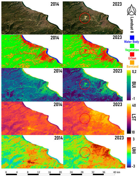 Spatiotemporal comparison of land cover and surface characteristics between 2014 (left) and 2023 (right) using Landsat 8 imagery. The red circle indicates the newly established organized industrial zone, illustrating significant urban expansion over time. Top to bottom: true color composite, land cover classification, Built-Up Index (BUI), Land Surface Temperature (LST), and Urban Heat Island (UHI) intensity.