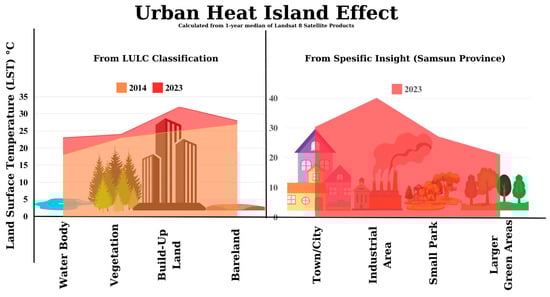 In the LULC classification, water bodies maintained low LST values below 23 °C for both years, while vegetation showed a slight increase, remaining at approximately 24 °C. Built-up land exhibited the greatest increase, from approximately 25 °C in 2014 to more than 31 °C in 2023. The bareland area also increased from approximately 27 °C to 28 °C. Specific insights from Samsun Province in 2023 indicate that town/city areas have LST values of approximately 30 °C, industrial areas are close to 40 °C, small parks are approximately 27 °C, and larger green areas are near 21 °C. Analysis using one-year median composite images revealed that the LST varied with the size and type of vegetation, with a mean LST differential between all green spaces and urban areas averaging 7–8 °C, and differences reaching 12 °C in industrial zones (Figure 10). This result is consistent with the literature: Ref. [71] reported that, on average, the mean LST of impervious surfaces (ISs) is approximately 3 °C higher than that of green spaces (GSs) in the megacities of Southeast Asia, and another study by [72] revealed a 6°C difference in Tehran.
