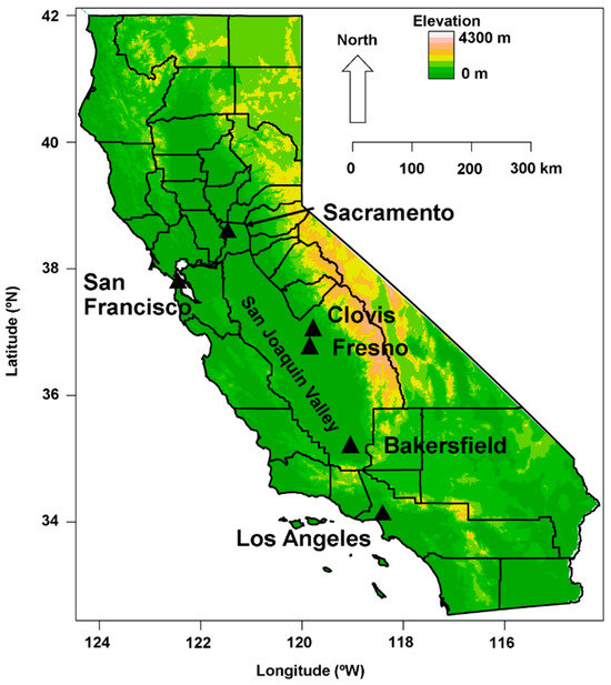 The focus of this study is the SJV. The SJV is located in the southern half of the Central Valley of California. The SJV is largely rural and produces a significant part of the agricultural output of the state but also has large urban centers (Stockton/Modesto, Fresno, Visalia, and Bakersfield). The climate here includes hot, dry summers and mild winters with dense tule fog. Rain typically occurs during the winter and spring. The SJV is an ethnically diverse area, with about half the population being Latino. Additionally, the SJV has one of the highest percentages of the population living below the federal poverty line in the United States. The area has coastal ranges to the west and the Sierra Nevada to the east. These mountains tend to create poor dispersal conditions, and therefore, air pollutants can remain for extended periods of time, creating one of the most polluted air sheds in the country for PM2.5. This study uses long-term air quality data collected from Fresno, Clovis, and Bakersfield (Figure 1).