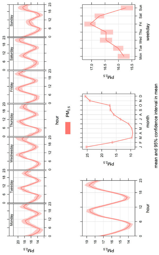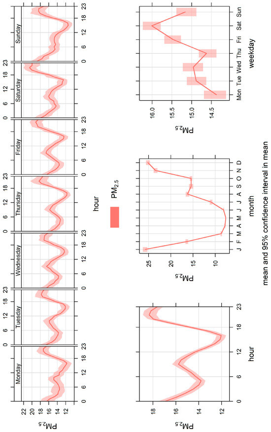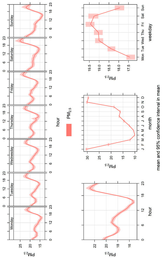 Figure 4 shows the PM2.5 diurnal, weekly, and monthly patterns for the monitoring site in Bakersfield. The overall diurnal pattern in Bakersfield has a peak concentration of 22.9 µgm−3 at 2200 and the lowest concentration of 15.3 µgm−3 at 1600.