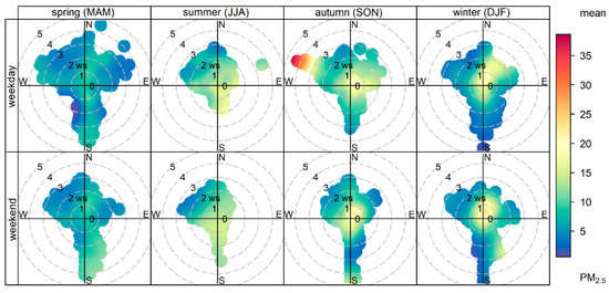 Pollution exposure levels with average concentrations of around 12.0 to 17.0 µgm−3 are mostly created by activities near the monitor when the winds are calm. The highest PM2.5 level exposures (concentrations greater than 25 µgm−3) came to Fresno from the WNW and NWbW directions when the wind speed was higher than 3.5 ms−1 (Figure 5). This elevated exposure occurred during the months of September, October, and November, but mostly during the weekdays. During the spring, which has the lowest PM2.5, the highest concentrations (between 9.0 and 13.0 µgm−3) came from the N, NbE, NNE, S, and SSE. During the summer, PM2.5 levels higher than 17 µgm−3 came from the S, SSE, and SE and from locations closer to the monitor. During the winter, concentrations of PM2.5 higher than 17 µgm−3 come from the N, NNE, and NE and from local sources, given the occurrence of higher PM2.5 levels during calm winds.