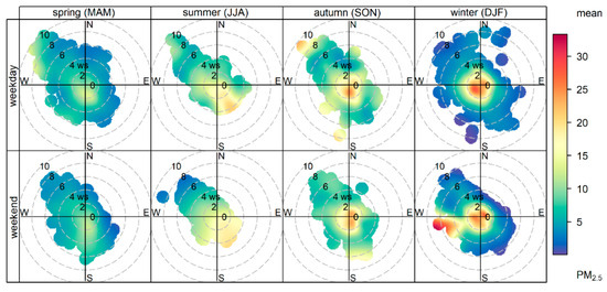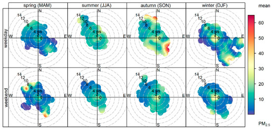 These maximum concentrations occurred in the autumn (September, October, and November) and winter (December, January, and February). The months of March, April, and May have the lowest PM2.5, with the highest levels (around 13 µgm−3) occurring when the winds came from the S and the wind speed was less than 2 ms−1. During the summer (June, July, and August), the highest concentrations of PM2.5 (ranging between 16.0 and 19.0 µgm−3) occurred when the winds came from between the south and east quadrants. During September, October, and November, the highest PM2.5 concentration, ranging from 17.0 to 25.0 µgm−3, came from all directions when the winds were less than 1 ms−1 and was most likely from local urban activities, given the transport conditions with low wind speeds and calm winds. The highest concentrations occurred during the winter months of December, January, and February, with the highest PM2.5 levels ranging between 20.0 and 30.0 µgm−3 from all directions when the winds were less than 1 ms−1, indicating that local sources impact this location. The highest PM2.5 levels (ranging from 23.0 to 33.0 µgm−3) at Clovis occurred in the winter during the weekend when the wind speed was higher than 4 ms−1.