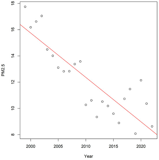 There were 41 sites in California with data from 1999 to 2022, with daily mean concentrations. Compiling these sites as an estimate of the statewide PM2.5 trend shows a decline in the average annual PM2.5 (r2 = 0.73 and p-value < 0.001 pearson −0.86; spearman −0.88). This trend analysis suggests that across California, emission reductions have been very effective in reducing annual PM2.5 (Figure 8).