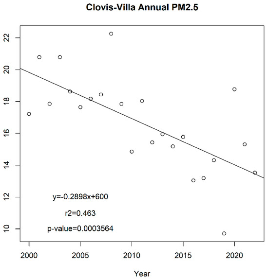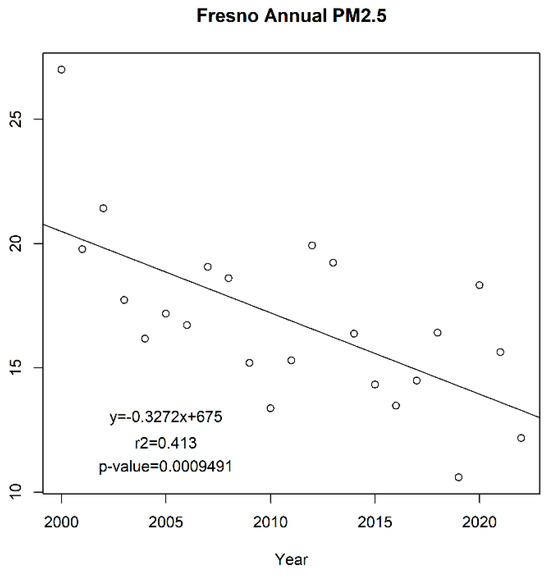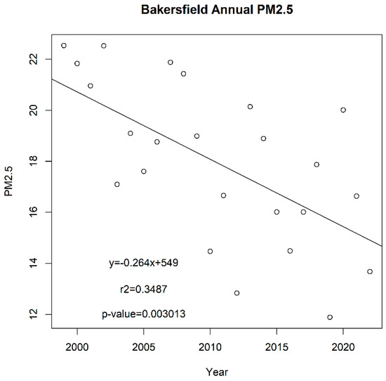 However, the reduction of the annual PM2.5 has slowed down since 2010, although the correlation is weaker, with an r2 value of 0.004 and a p-value of 0.829 (pearson −0.07; spearman −0.05) (Figure S6). For the years 1999 to 2022, linear regression correlation was at an r2 value of 0.81 and a p-value of <0.001 (pearson −0.90; spearman −0.85). Overall, PM2.5 levels are higher in the San Joaquin Valley urban locations than in the rest of California. The annual PM2.5 has also been decreasing in Fresno, Clovis, and Bakersfield (Figure 9, Figure 10 and Figure 11).