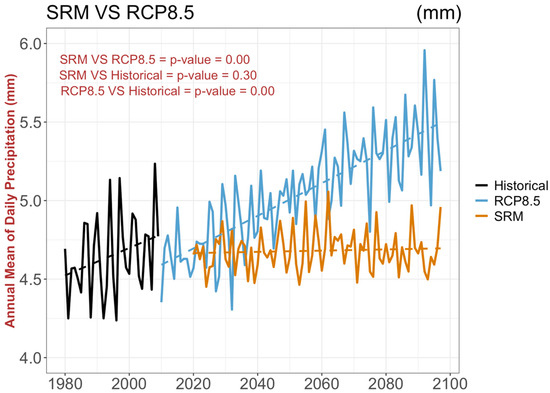 Figure 2 presents time series data for the historical period (1980–2009) and future projections (2010–2100) under the RCP8.5 and SRM scenarios to illustrate long-term trends. While the figure displays the full projection horizon, the primary analysis in this study focuses on the 2051–2080 period to evaluate long-term SRM impacts. During the historical period, annual means of daily precipitation ranged between approximately 4.25 mm and 5.25 mm. Under the RCP8.5 scenario, precipitation exhibits a steady upward trend, with values exceeding 5.5 mm by the end of the century. This increase is likely driven by enhanced surface evaporation and intensified monsoonal circulation in a warmer climate, potentially exacerbating the risk of flooding and hydrological extremes.