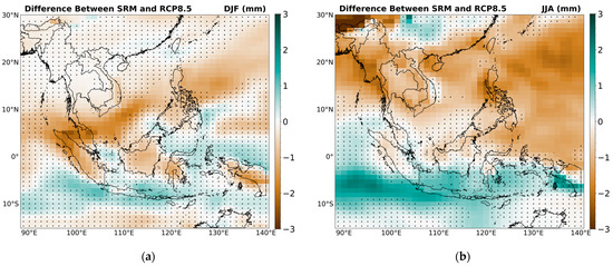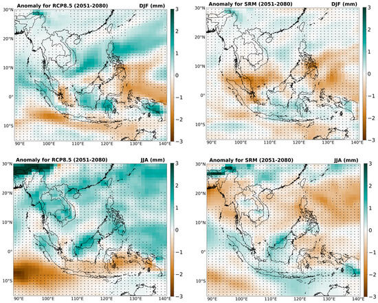 In comparison, the SRM scenario exhibits a more spatially heterogeneous and moderated response. During DJF, SRM slightly reduces precipitation over parts of mainland Southeast Asia but partially alleviates the drying signal over equatorial regions such as Kalimantan and Sulawesi. However, some regions, such as the southern Philippines and southern Borneo, still experience reduced rainfall, indicating that SRM does not uniformly reverse the effects of warming on precipitation. During JJA, SRM appears to mitigate the most severe drying observed under RCP8.5 in parts of the Maritime Continent, notably in Java, eastern Indonesia, and the Timor Sea region, where anomalies shift closer to neutral or even slightly positive. Nevertheless, precipitation deficits persist over Borneo, the South China Sea, and northern Philippines, reflecting the spatially variable effectiveness of SRM in restoring monsoonal precipitation.