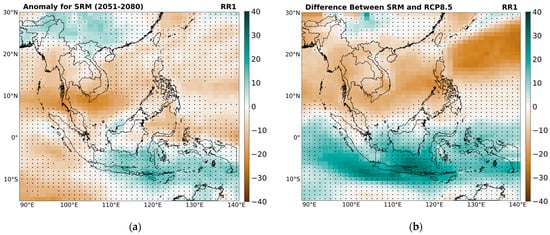 The right panel, showing differences between SRM and RCP8.5, reinforces these patterns. A substantial mitigation of drying is observed across Indonesia, particularly over Java and southern Sumatra, where SRM preserves or even increases wet-day frequency relative to the RCP8.5 baseline. In contrast, the Philippines stands out as a region with the most severe decrease in RR1 under SRM compared to RCP8.5—an outcome that raises potential concerns about intensifying drought risks despite the overall cooling benefits of SRM.