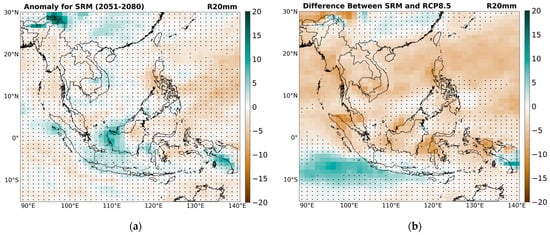 Under the SRM scenario, the left panel reveals a generally modest change in R20mm across much of Southeast Asia, with anomalies ranging from −5 to +5 days per year compared to the historical baseline. However, distinct spatial variations are evident. The majority of mainland Southeast Asia—including central Vietnam, Laos, and northeastern Thailand—show a decrease in the frequency of heavy precipitation events, with reductions of 1–5 days annually. These reductions suggest a suppression of convective activity, potentially linked to SRM-induced changes in upper-level stability and lower moisture availability. Stratospheric aerosol injections tend to cool the surface more than the upper troposphere, increasing static atmospheric stability and inhibiting vertical motion. Additionally, the reduction in solar radiation can lead to lower surface evaporation and reduced boundary-layer moisture, especially during peak convective seasons. By contrast, the right panel shows that SRM increases the frequency of R20mm events in certain parts of the Maritime Continent relative to RCP8.5. Notably, Java, southern Sumatra, parts of Kalimantan, and Papua exhibit increases of 3–5 days per year. This enhancement may reflect persistent moisture convergence interacting with existing orographic features. In mountainous regions such as Java and Papua, even modest increases in low-level moisture under SRM may enhance orographic precipitation, despite the topography itself remaining unchanged. These areas—characterized by complex terrain and strong mesoscale circulation—appear more resilient in maintaining conditions conducive to heavy rainfall under SRM.