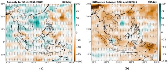 The spatial anomalies and SRM–RCP8.5 differences in Rx5day are depicted in