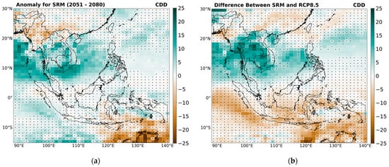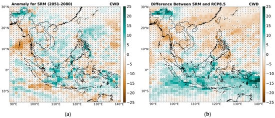 The SRM–RCP8.5 difference map (right panel) further highlights the contrasting regional responses. Compared to RCP8.5, SRM effectively mitigates the reduction in CWD in much of maritime Southeast Asia, particularly over Indonesia, where the positive differences suggest a restoration or even slight extension of wet spell durations. Conversely, mainland regions such as Vietnam, Thailand, and the Philippines continue to show a reduction in CWD relative to RCP8.5, indicating that SRM may not fully counteract the drying trends projected under high-emission pathways for these areas.