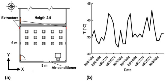 (a) XY plane view of the studied classroom. (b) Daily maximum temperature in Veracruz, Mexico, in May 2024.