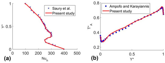 Two problems in turbulent regime previously reported by Saury et al. [52] and Ampofo and Karayiannis [53] are simulated to validate the results of the present study, obtained through numerical simulations. In Figure 2a, we compare the Nusselt number as a function of height for a three-dimensional cavity with two of its vertical walls at different temperatures. Figure 2b shows the comparison of temperature along the mean width of a three-dimensional square cavity differentially heated on two of its vertical walls.