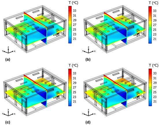 Temperature fields inside the classroom over 60 min. (a) 5 min. (b) 15 min. (c) 45 min. (d) 60 min.