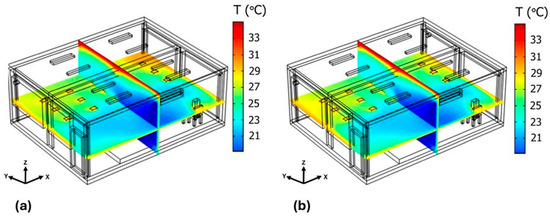 Temperature fields inside the classroom at t = 60 min. (a) Case 1A (b) Case 1B.