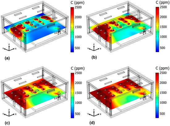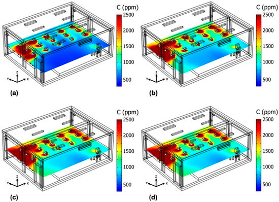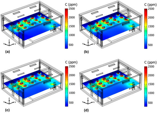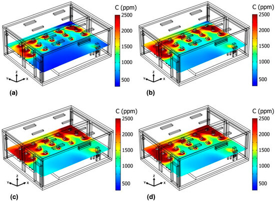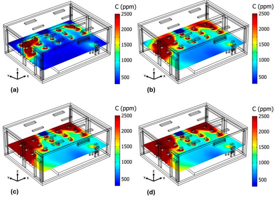 Figure 11 shows the behavior of CO2 concentration when four OACs are stacked at the back and center of the classroom (Case 9C). As time passes, the CO2 concentration increases. After 45 min (see Figure 11c), the average CO2 concentration in the classroom is 1731 ppm. After 60 min (see Figure 11d), the average concentration is 1747 ppm; by this time, high-CO2 level areas appear, predominantly in the southeast corner, the southwest corner, and the entire south wall of the classroom, except where the OACs are stacked.