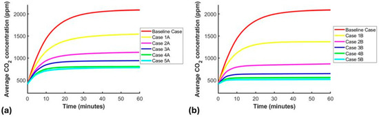 As shown in Figure 9a,b, the cases that achieve the most significant reduction in CO2 levels are Case 5A (782.5 ppm) and Case 5B (516 ppm). Both cases use extractors with a flow rate of 23.20 m3/min. However, Case 5A with one extractor does not achieve a CO2 level reduction to allowable levels.