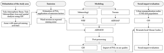 The primary objective of this study is to quantify the contribution of wind erosion from open-pit mining areas to air quality in the Tula Atmospheric Basin. A methodology is proposed (Figure 1) that involves (1) delimitation of the study area based on the official definition of the Tula Atmospheric Basin and spatial analysis using GIS to identify areas with open-pit mining activities; (2) estimation of PM10 emissions from wind erosion in exposed mining areas; (3) simulation of atmospheric dispersion using the coupled WRF-AERMOD modelling system; and (4) comparison of modeled concentrations with ambient air quality monitoring data and determination of the relative contribution of mining activities to air quality.