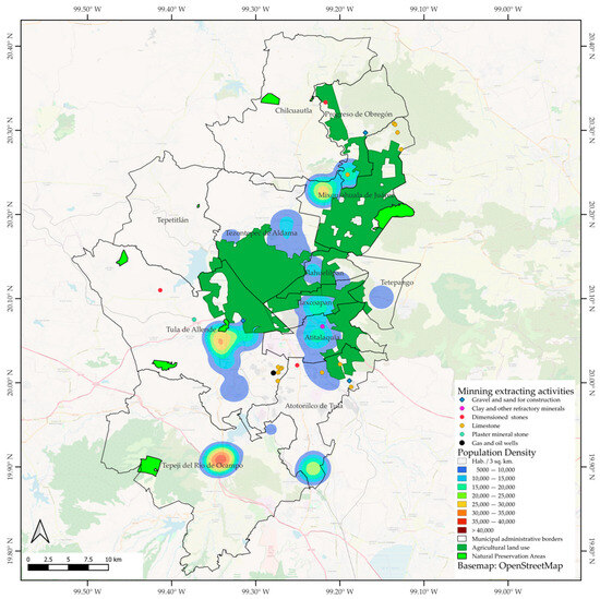 The main agricultural activities are concentrated north of the city of Tula, in the center of the study area around the Xicuco hill in the Tezontepec de Aldama municipality, and in most of the Mixquiahuala de Juarez municipality’s land, with some other spaces around rural urbanization areas in the eastern part of Atitalaquia’s municipality, while the northwest and south are more driven into natural ecosystems where low accessibility is common due to the mountain areas and ravines that supply the water dams present in the areas around Sayula town, Santa Maria Macua, Tepeiticm Texcatepec, Chilcuautl and San Luis Taxhimay. The Mexican National Institute of Statistics and Geography’s land use and vegetation database was used to analyze areas devoid of vegetation. Subsequently, these areas were examined for mining activities (Figure 2). The surfaces identified with this characteristic that are in the Tula atmospheric basin were selected and inputted into the model.