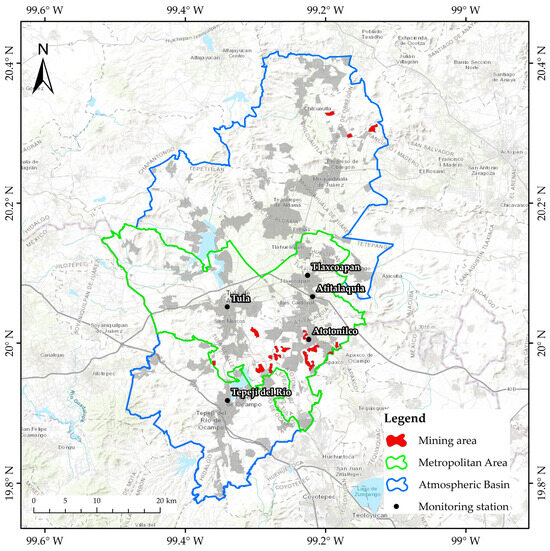 Thirteen areas with mining activities within the Tula metropolitan area (Figure 3 and Figure 4), located in the south-central portion of the atmospheric basin, were selected for this study. This selection was based on one key factor: the presence of air quality monitoring stations within the metropolitan area.
