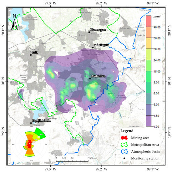 Table 4 shows the emission rate inputted into the model for each emission source, along with the reference coordinates and the surface area subject to wind erosion (1.40 × 10−6 g/m2). The 13 areas with mining activity are characterized by sites with extraction zones for construction materials, quarries, deposits, and material processing sites. These zones are geographically situated at higher altitudes compared to human settlements. This condition, coupled with meteorological variables, promotes the dispersion of particulate matter. Additionally, the Mezquital Valley is characterized by a desert ecosystem with low precipitation. Furthermore, the companies operating in these zones lack mitigation measures to prevent the dispersion of said particulate matter.