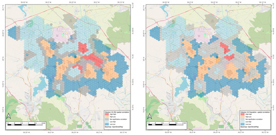The social impact of the dispersion of the pollutant was evaluated using a bivariate local Moran I index calculation [59]; for this purpose, a normalized hexagonal grid with 0.5 km distance between centroids was created; pollution, population [35] and Urban Marginalization Index (UMI) [60] data were gathered on the grid to homologate spatial coverage between variables. This was calculated using the following equation: