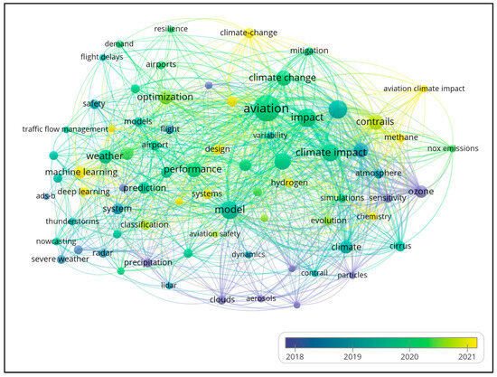 The analysis revealed that earlier research, represented by cooler colors, concentrated primarily on fundamental atmospheric studies, emission impacts, and basic modeling of weather phenomena affecting aviation. The chronological shift toward terms such as “resilience” and “machine learning” indicates that the research community is increasingly focused on practical and technological solutions. This evolution mirrors the growing urgency of climate adaptation in aviation. Terms such as “clouds,” “aerosols,” and “precipitation” were dominant in earlier years, reflecting a foundational understanding of meteorological factors. In contrast, more recent studies, highlighted in yellow tones, increasingly emphasize operational resilience, optimization through machine learning, and strategies for climate impact mitigation. Keywords such as “machine learning,” “deep learning,” “resilience,” and “mitigation” demonstrate a clear pivot towards applied technological solutions and adaptive strategies within aviation systems.
