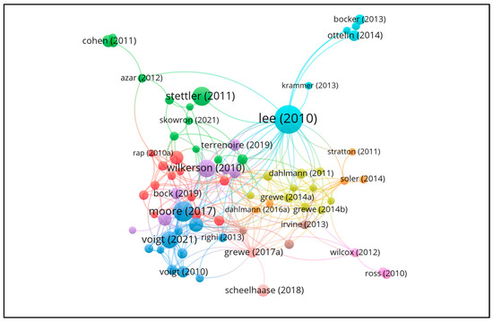 The citation analysis focused on identifying the most influential studies within the field of extreme weather impacts on air transport operations. The citation clusters show how foundational work on emissions has influenced newer research focused on resilience and adaptation. This transition underscores a shift in priorities from impact assessment to solution development. Documents that received at least 30 citations were included, resulting in a network comprising 71 highly cited publications. This set of papers forms the intellectual foundation for ongoing research and highlights critical contributions to the understanding and management of extreme weather risks in aviation.