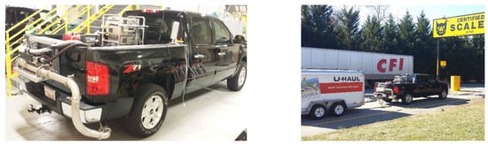 All vehicles were made to haul the same trailer weight, and towing capacity was not exceeded for any vehicle. Vehicle and trailer weights were measured using certified CAT scales at a local truck stop (see Figure 1, righthand photo). On-road measurements were collected using 3 PEMS units: 2× SEMTECH DS and 1× SEMTECH ECOSTAR (Sensors Inc., Saline, MI, USA). Figure 1 (lefthand photo) shows a test vehicle with a PEMS unit attached. All PEMS units were calibrated and zeroed before and after every driving route. Specifically, the PEMS equipment used in this study complies with standard operating procedures and is certified and maintained in accordance with the 40 CFR 1065 Subpart J PEMS protocols [42]. In addition, the PEMS post-process software (SEMTECH data processor, version 2.018) has built-in QA/QC protocols to ensure proper sample flows, temperatures, and subsystem components were operating properly during the test and within the tolerances specified in accordance with 40 CFR 1065 Subpart J protocols.