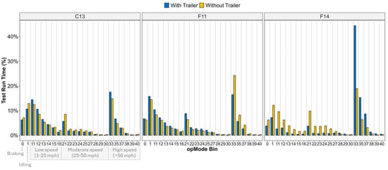 Percent of time spent in each opmode bin for the three tested trucks (C13, F11, F14), shown with and without trailer towing. To provide additional context, opmode bins have been labeled by speed category.