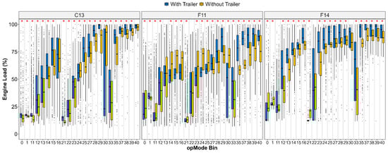 Comparison of engine load (%) at different opmode bins for tested trucks (C13, F11, F14) with and without trailer towing (statistically significant differences [p < 0.05] are indicated by *).