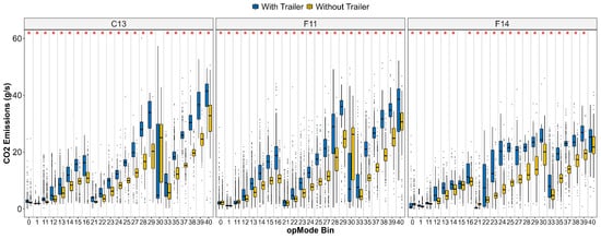 Comparison of CO2 emission rates at different opmode bins for tested trucks (C13, F11, F14) with and without trailer towing (statistically significant differences [p < 0.05] are indicated by *).
